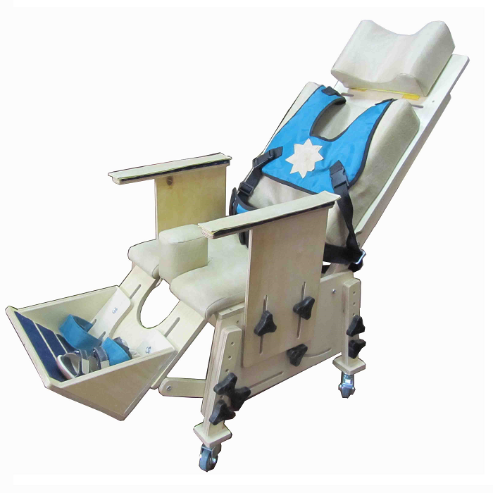 Создаёт правильное, симметричное положение за счёт изменяемых по высоте ножек и подлокотников, тазобедренного крепления, в виде одиночного ремня, установленного под углом 45°, комплексного нагрудного крепления «Уздечка» и абдуктора.