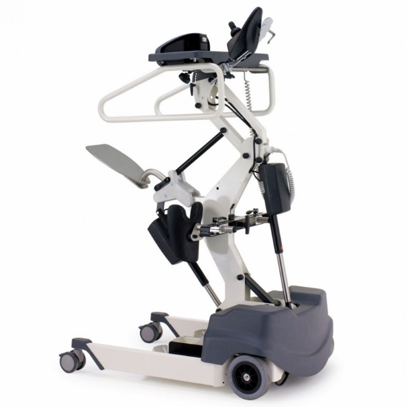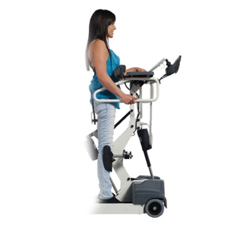 Модель максимально адаптирована для самостоятельного использования больным. Есть откидные опорные ручки, грудной упор с регулируемым углом наклона, отстегивающийся ремень-фиксатор, подколенные упоры, фиксатор пяток. Подъемный рычаг может быть удлинен и подстроен под индивидуальные особенности владельца. На грудном упоре есть кнопка экстренной остановки подъема. Отличная альтернатива креслу, помогающая в разработке и укреплении малоподвижных мышц.