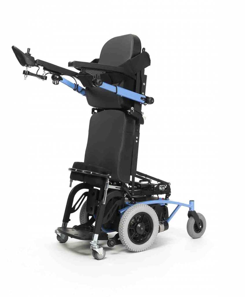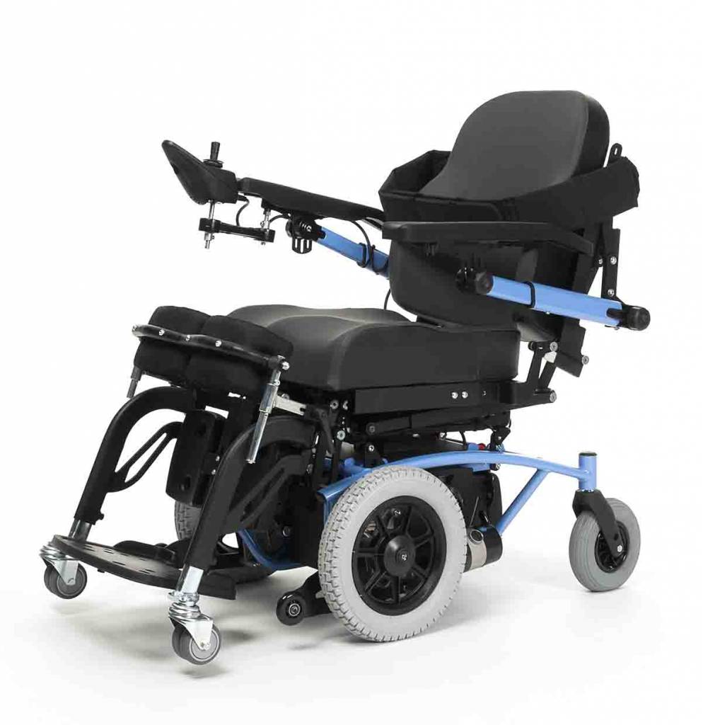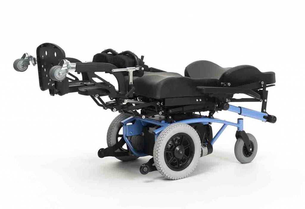В данной модели есть возможность установки заднего привода.По желанию клиента кресло-коляску можно оборудовать специальной функцией электрических регулировок наклона сидения,спинки и ортопедических подножек.