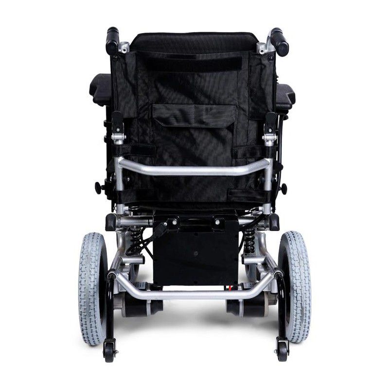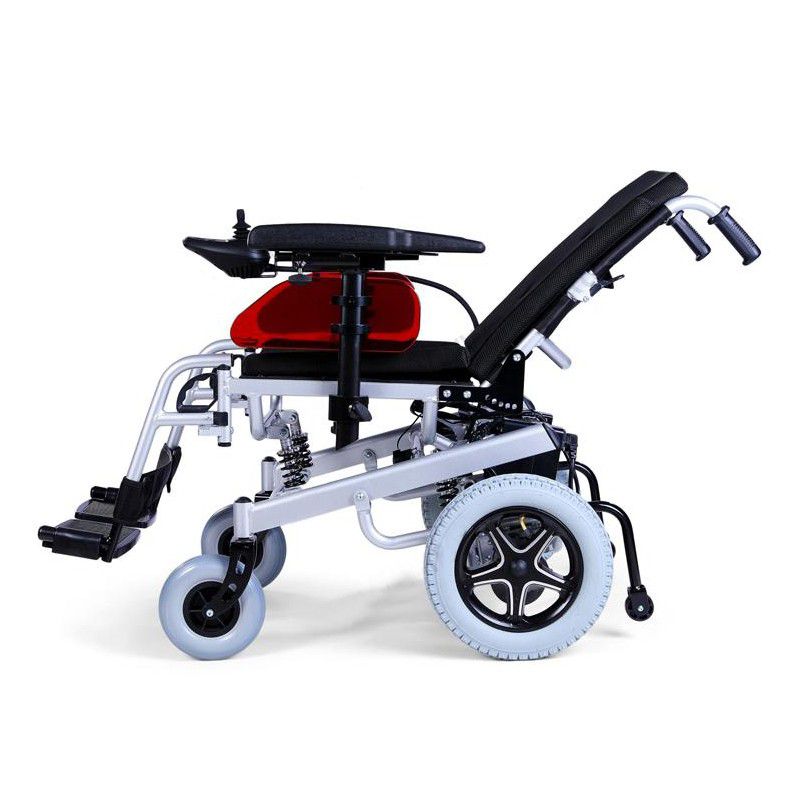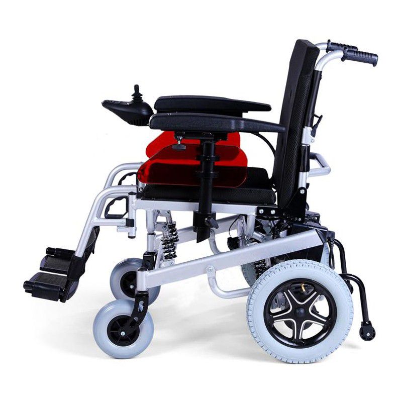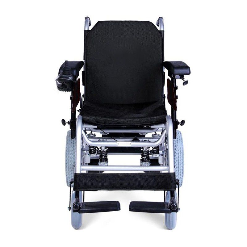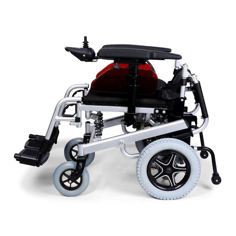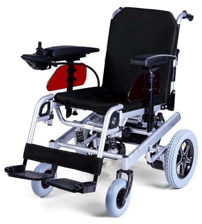 Электрическая кресло-коляска на четырех полноценных амортизаторах для уверенной езды по дорогам с неровным покрытием.