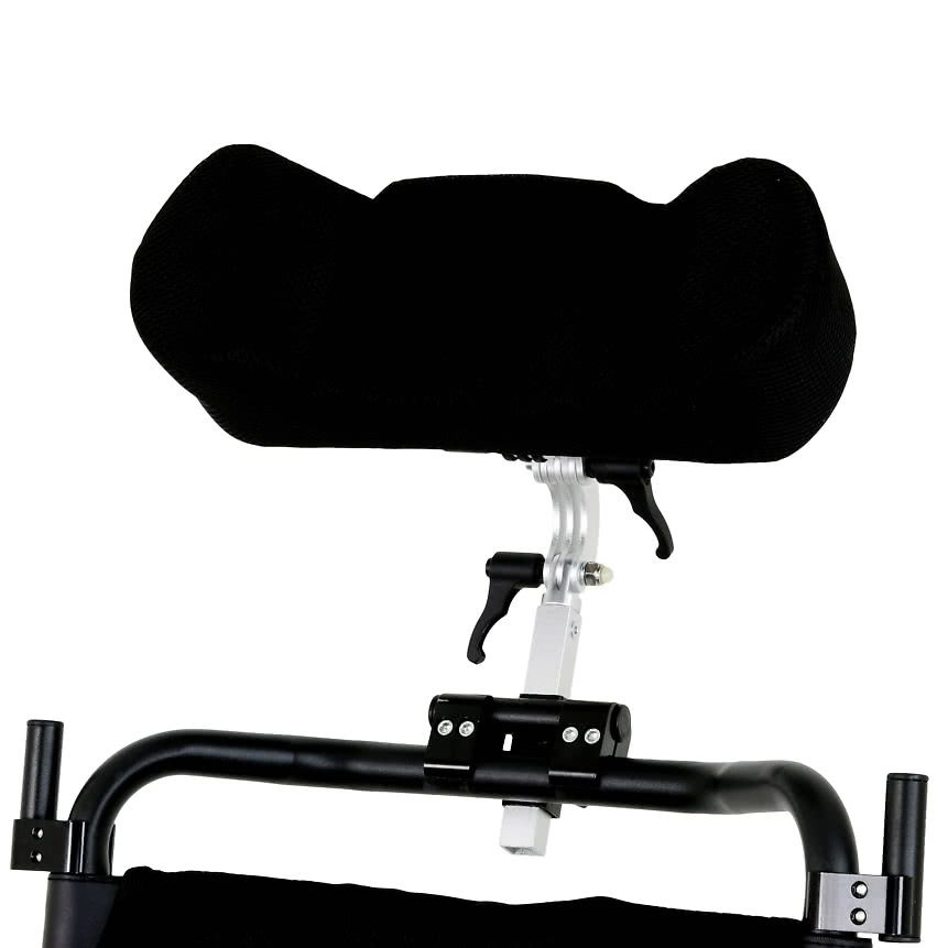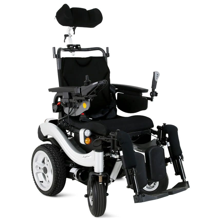 Современное электроприводное кресло-коляска, снабжённое индивидуально-позиционируемым шейным фиксатором-подголовником, имеет регулируемые по углу наклона в коленном суставе подножки с регулировкой длины под голень.