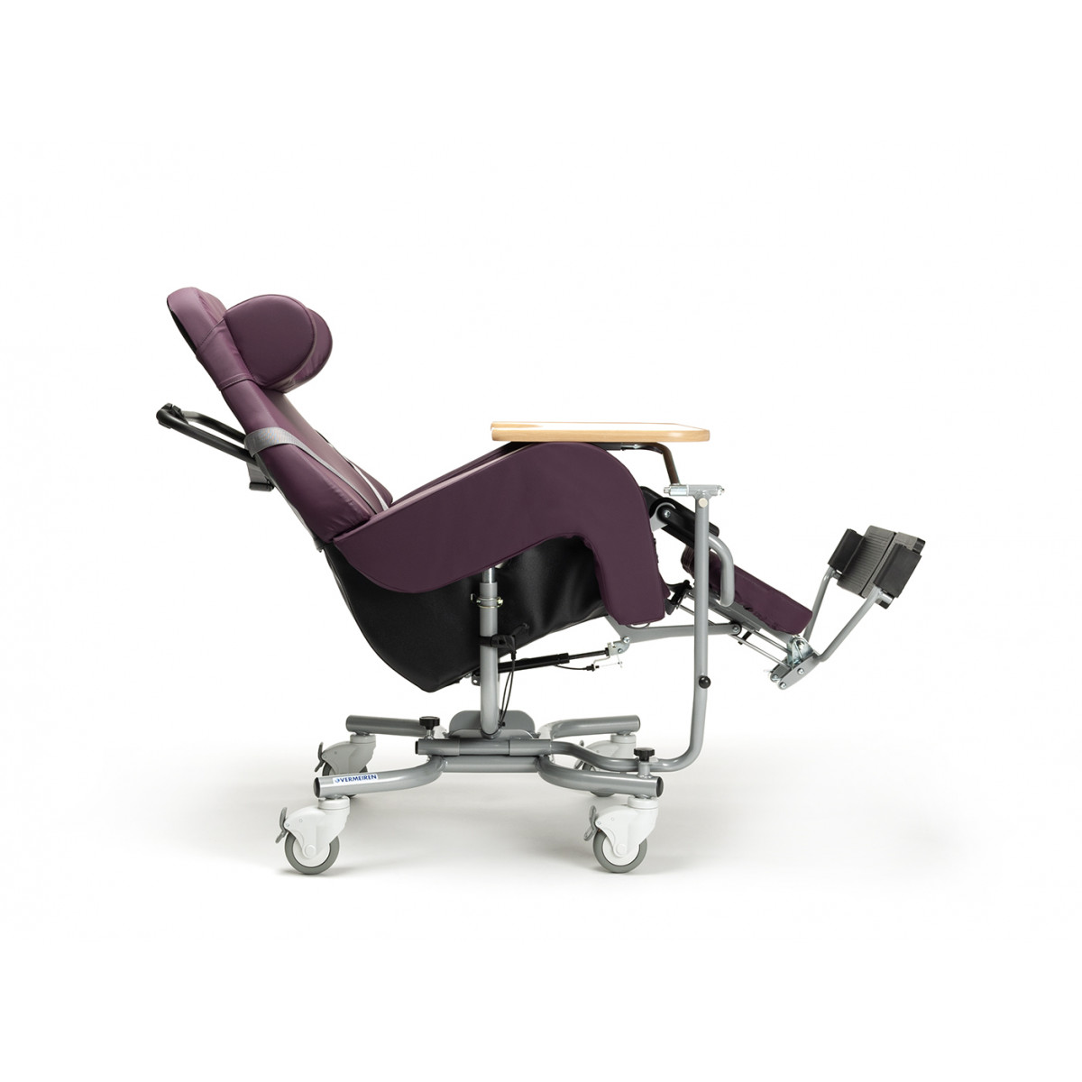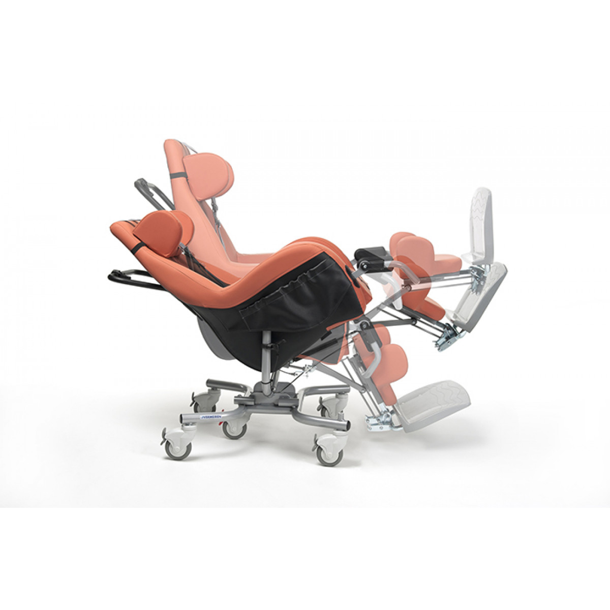 В данной модели предусмотрена возможность плавной регулировки угла наклона гериатрического кресла от – 4° до + 36° с помощью гидравлических цилиндров. Удлинение подножки происходит при помощи автоматического удлинения. В изготовлении сидения используется мягкая прочная дышащая обивка Dartex с запоминанием формы тела человека. В данной модели заложена функция регулировки высоты посадочного места от пола с помощью подушек сидения, выпускаемых с разной толщиной 60- 80- 100 мм.