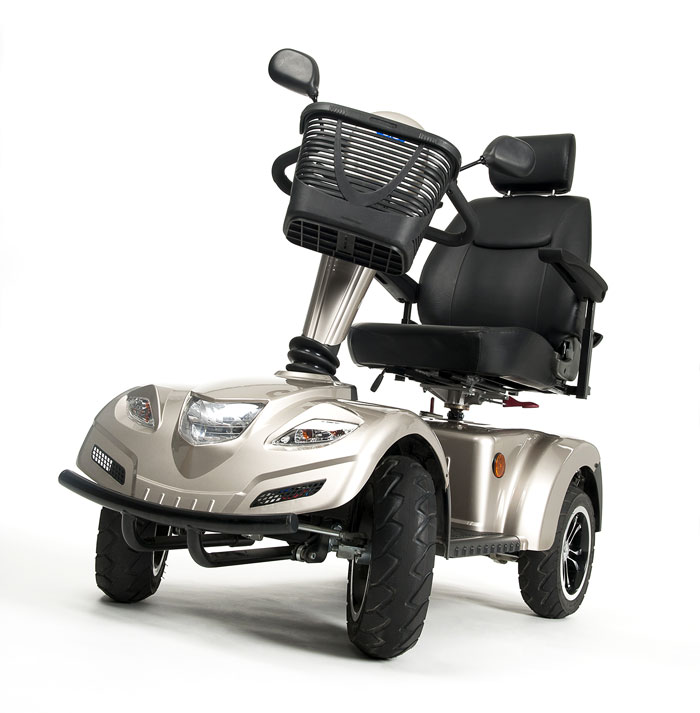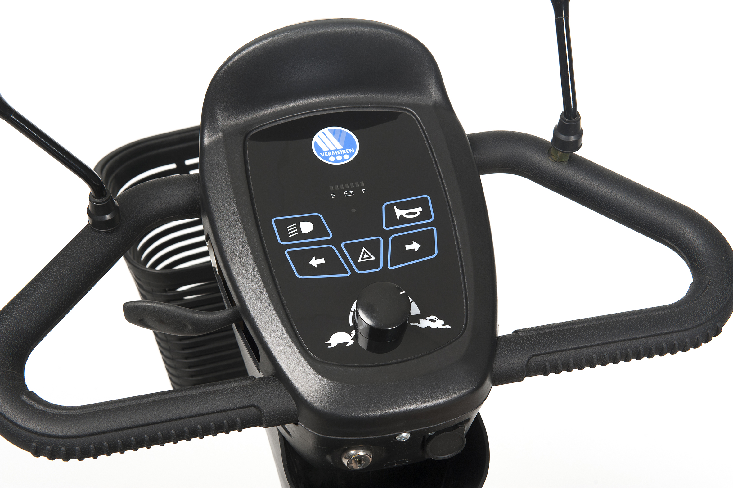Регулируемый блок управления позволяет оптимально настроить руль под пользователя. Скутер электрический оборудован удобным рулем в виде петли, что препятствует соскальзыванию рук пользователя. Дополнительно можно установить держатель для трости, ходунков или бутылки и багажный отсек.