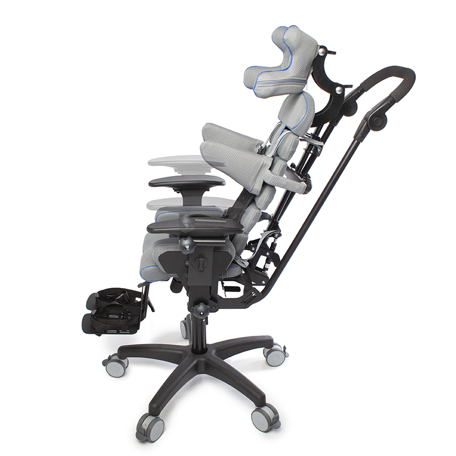 Конструкция кресла Baffin neoSIT : сиденье, спинка, боковые упоры для туловища, подножка с опорами для стоп, подголовник, ремни для бедер, ремень-жилет и опорная рама. Съемную обивку можно стирать.
