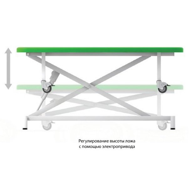 - Стол имеет два положения: транспортное (на колесах) и рабочее (на ножках). При проведение процедур колеса убираются и стол жестко встает на ножки;