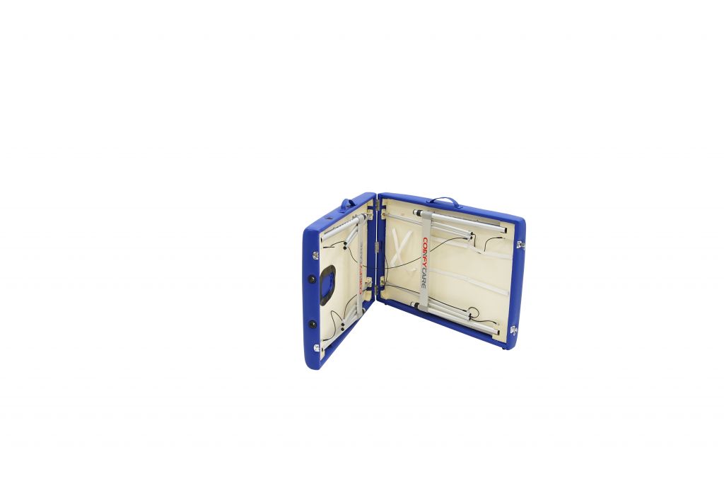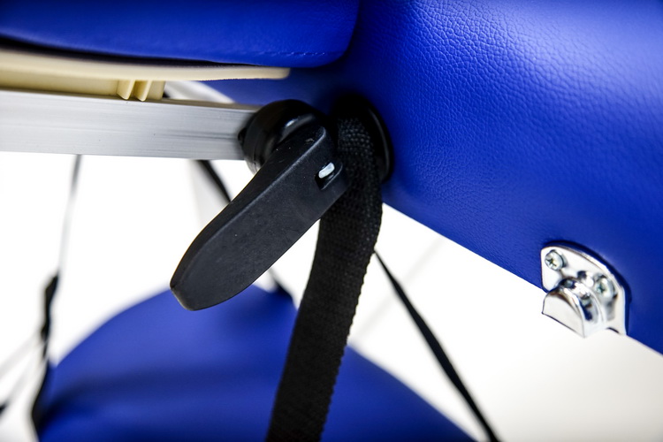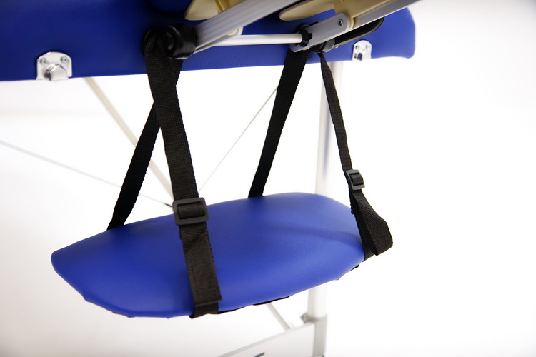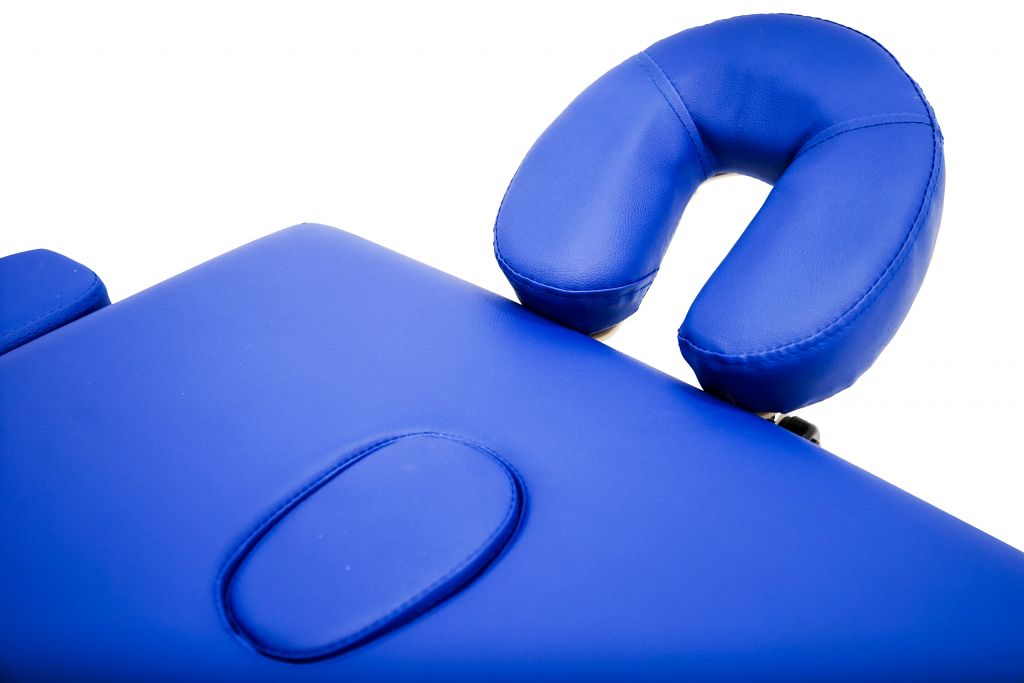 Массажный стол-чемодан со складной панелью из синей экокожи. Подковообразный, регулируемый по углу наклона подголовник снабжён регулируемой мягкой полочкой для рук, а съёмные расширители ложа обеспечивают комфортное размещение пользователя в любом необходимом положении, благодаря закрывающемуся инсертом лицевому люверсу. Телескопическая регулировка высоты ножек на пружинно-шариковых фиксаторах позволяют установить стол на высоте, удобной как клиенту, так и массажисту.