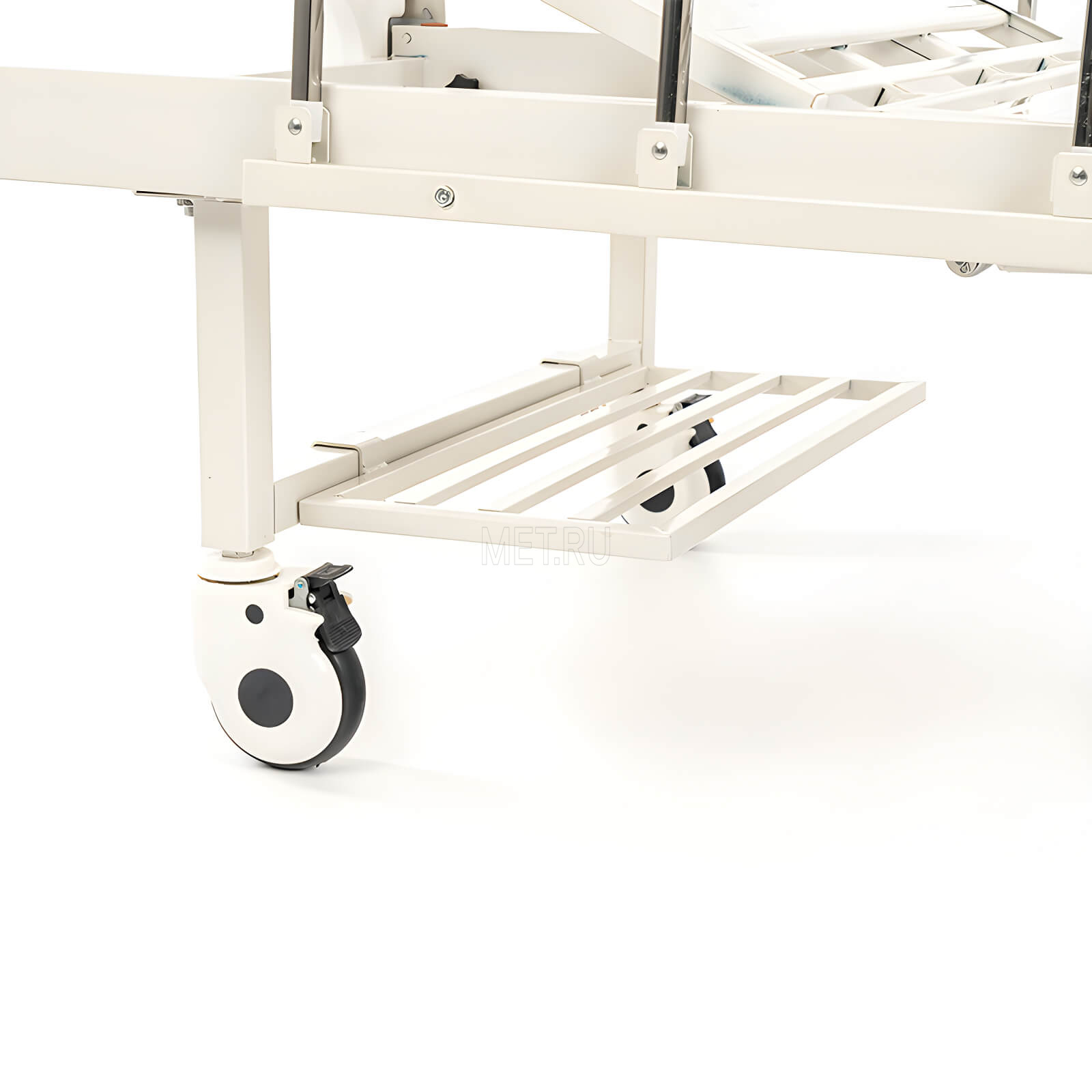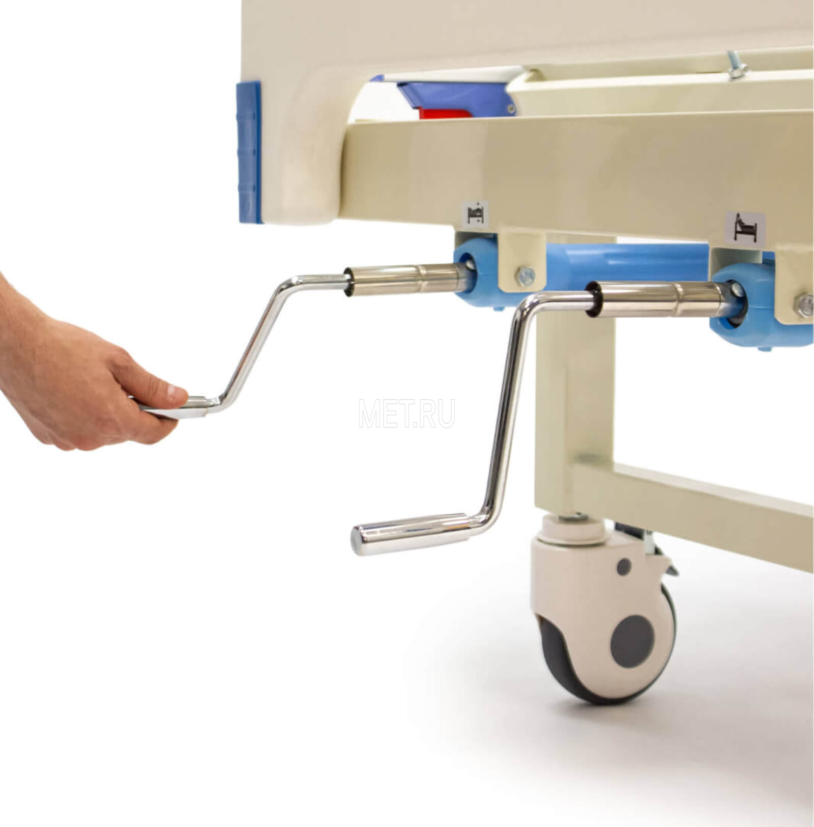 - Выдвижные регуляторы положения ложа расположены в ножной части кровати, что позволяет персоналу легко регулировать положение ложа