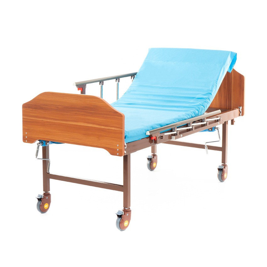 Экономичная двух-функциональная кровать с ПЕРЕВОРОТОМ (поворотом) больного с помощью винтовых регулировок ложа и независимыми винтовыми регулировками угла наклона спинной секции.