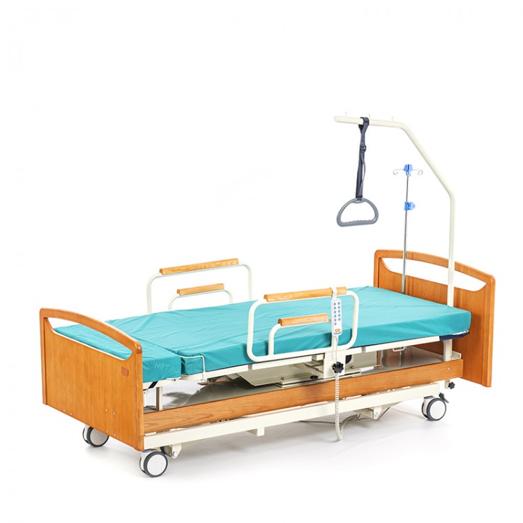 Медицинская кровать с электрическим приводом и поворотным креслом удобна как для пациента, так и для человека, ухаживающего за ним.