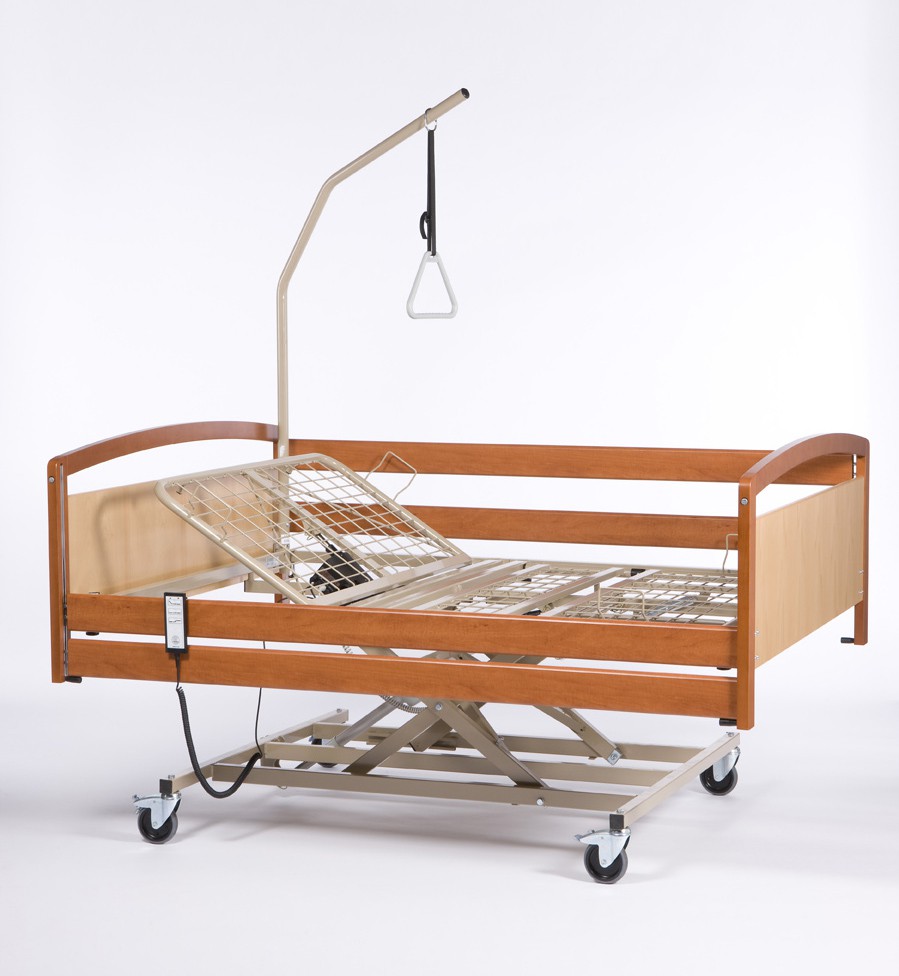 Многофункциональная кровать с электроприводом оборудована четырьмя колесами с индивидуальными тормозами на каждом колесе. Модель оснащена деревянными боковыми ограждениями для безопасности пациента и устройством для подтягивания, которое позволяет пользователю изменять положение тела.