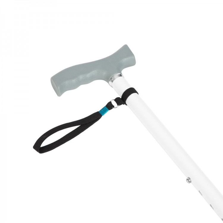 Регулируемая по высоте трость с Т-образной рукояткой светоотражающим элементом со страховочным ремешком и противоскользящими насадками.