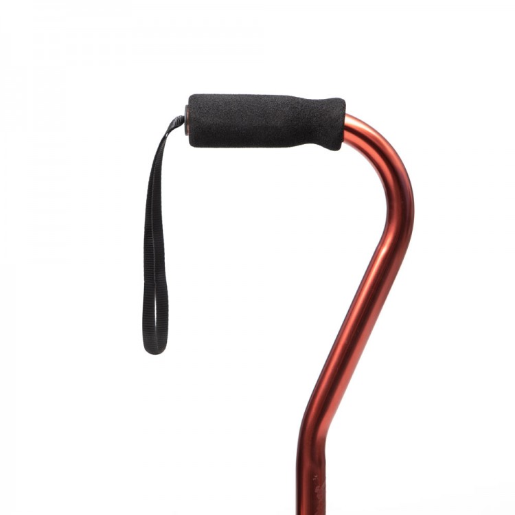 Регулируемая по высоте трость с Г-образной рукояткой светоотражающим элементом, со страховочным ремешком и с устройством против скольжения.