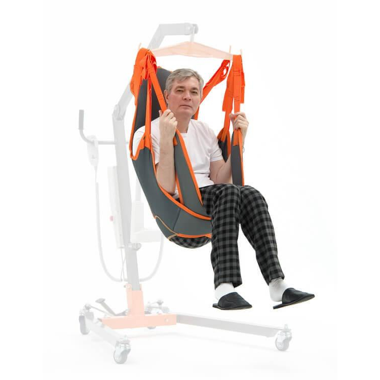 Перевязь для инвалидного подъёмника, снабжённая жёсткими вставками, дополнительно поддерживающими естественный люмбальный изгиб позвоночника