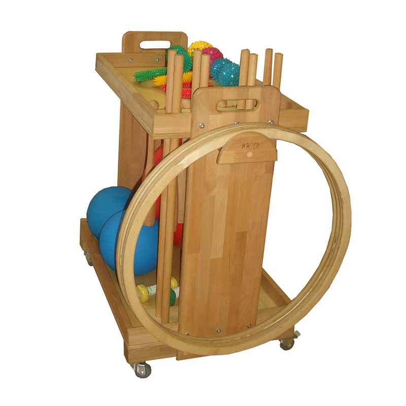 Тележка из натурального дерева на колесах с тормозами. Предназначена для хранения гимнастических снарядов для занятий лечебной физкультурой в условиях специализированных реабилитационных и гимнастических залов.