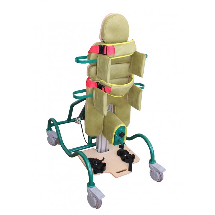 Размер 1,2: Многофункциональный вертикализатор с металлической рамой и с поворотным ложем со съемными модулями, подножкой со стоподержателями, абдуктором, системой креплений, боковыми упорами и съемным столиком. Привод - пневматический
