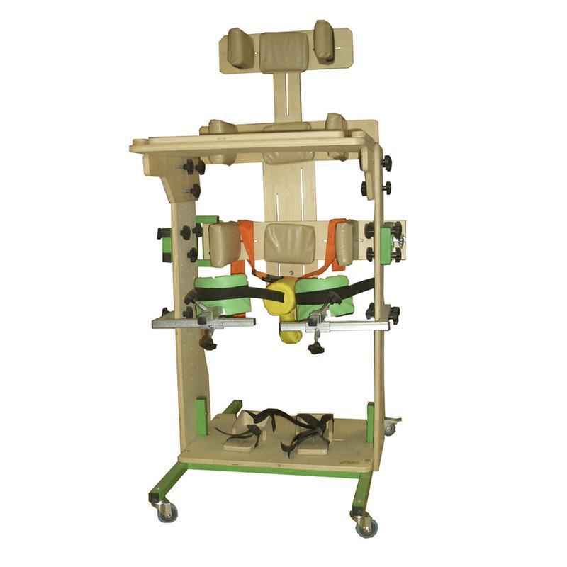 Опора для стояния представляет собой вертикальную раму, оснащённую креплениями для ступней, системой коленных креплений, обоймами для крепления грудного и бедренного отделов, абдуктором, столиком и подголовником. Рама опоры установлена на металлическом 4-х колесном основании. Крепления для ступней регулируются в любом направлении по плоскости подножки, а коленные крепления независимо регулируются в трёх плоскостях с возможностью закрепления в любом выбранном положении. Грудная и бедренная обоймы регулируются по высоте относительно пола и по ширине при помощи мягких боковых упоров-ограничителей.